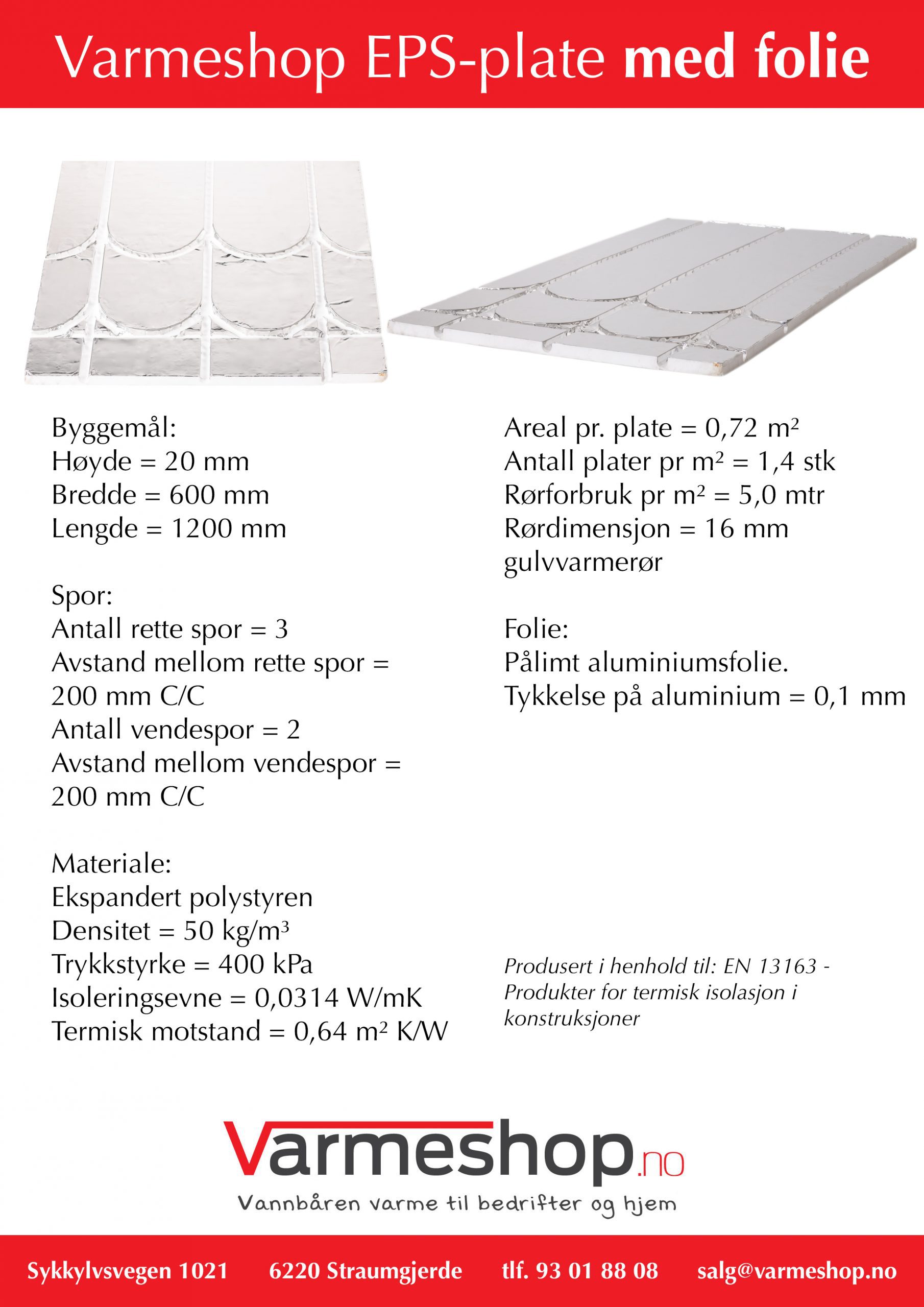 Gulvvarmeplater i trykkfast og støpt EPS400 materiale, kun 20 mm byggehøyde, tilpasset alle 16 mm gulvvarmerør. Med disse platene slipper du å legge ut varmefordelingsplater! Her er det pålimt en solid og tykk aluminiumsfolie som fungerer som varmespreder og gir en varmeeffekt som er på høyde med varmefordelingsplater.